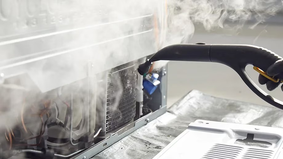김치냉장고 뒷면 기계실의 냉각핀 및 쿨링 팬 이물과 먼지를 꼼꼼하게 세척합니다.